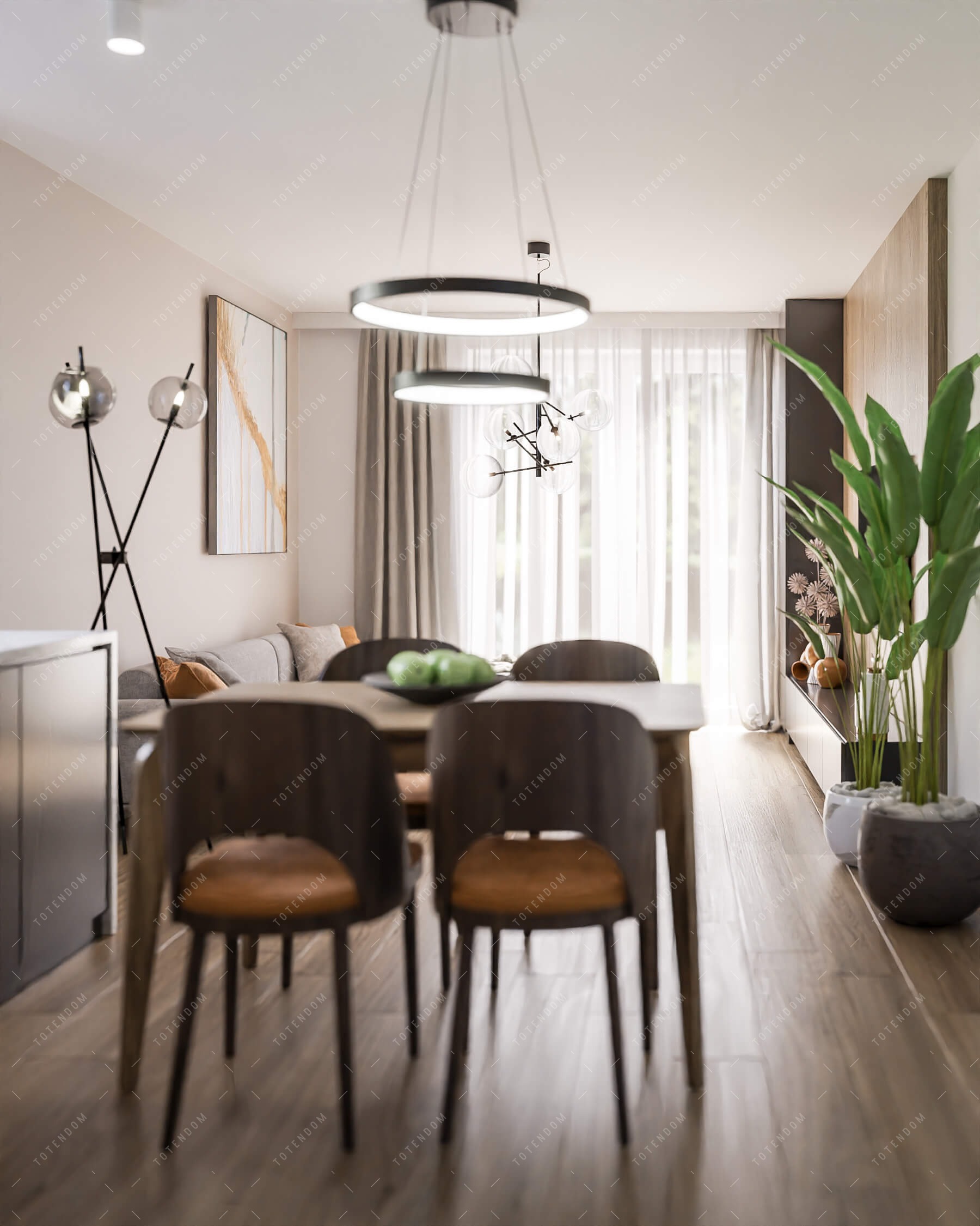 Salon utrzymany w stonowanej kolorystyce z wyraźnym akcentem przezroczystych lamp kulowych. Kanapa rogowa stanowi centralny punkt spotkań, a panele podłogowe dodają przytulności. Ciemna szafka pod telewizorem zapewnia praktyczne przechowywanie. To wnętrze emanuje spokojem i elegancją, tworząc harmonijne miejsce do wypoczynku i relaksu.