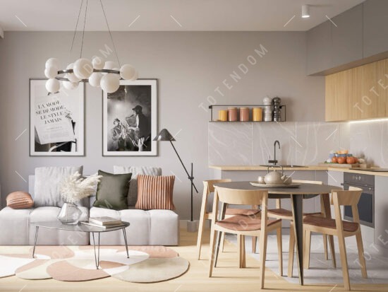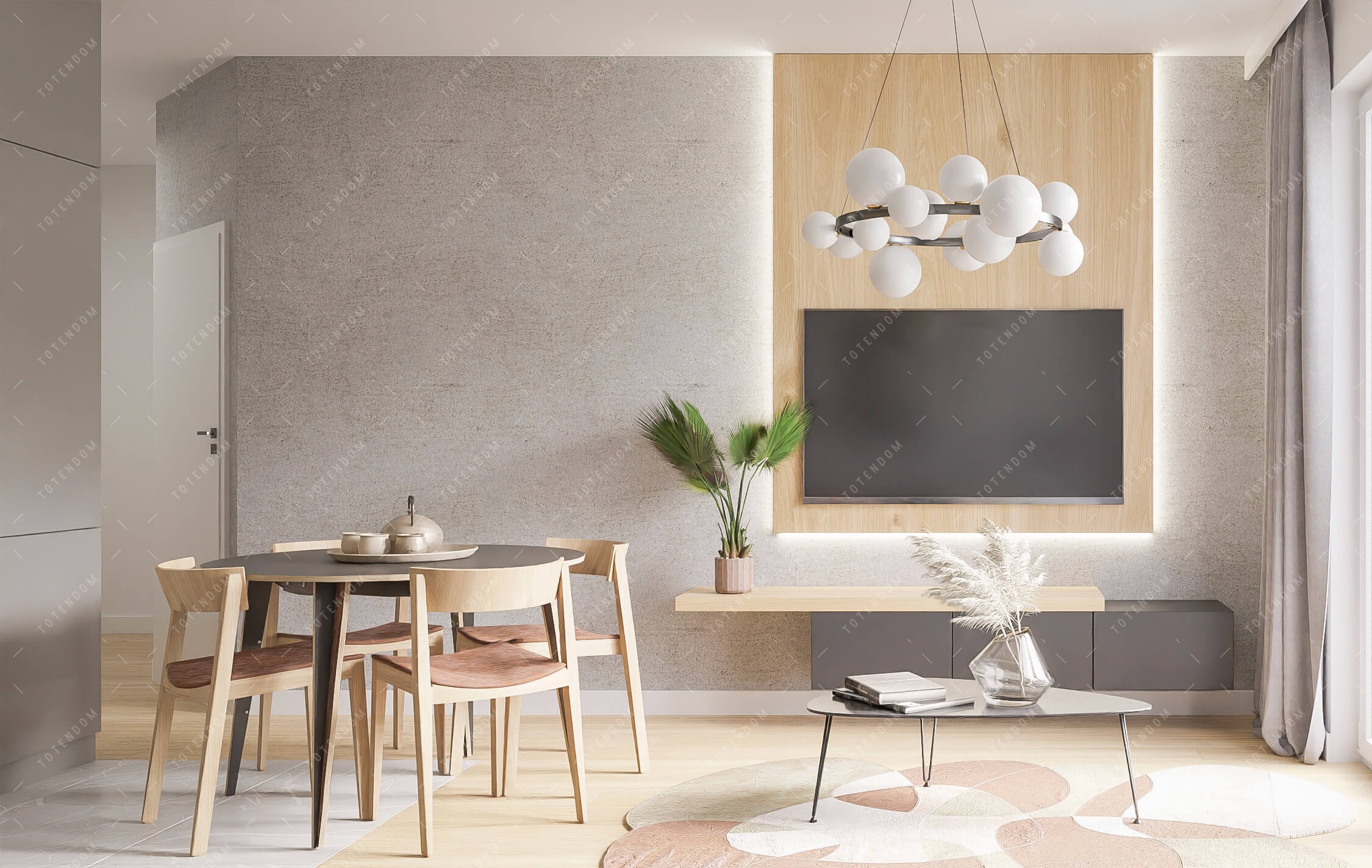 Wizualizacja salonu, gdzie efektowny dywan dodaje charakteru i podkreśla styl wnętrza. Elementy drewna dodają naturalnego uroku i ciepła. Szara kanapa zapewnia wygodne miejsce do wypoczynku, a asymetryczny stolik ozdobny stanowi interesujący akcent. Okrągły stół z krzesłami tworzy przyjemną przestrzeń do spotkań i posiłków. To wnętrze emanuje harmonią, elegancją i nowoczesnością, tworząc przytulne i funkcjonalne miejsce do spędzania czasu.