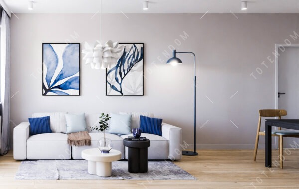 Wizualizacja salonu, gdzie lampa podłogowa stanowi efektowny punkt oświetleniowy, dodając przytulności i ciepła. Granatowe akcenty w wystroju wnętrza tworzą kontrast i nadają mu wyrazu. Duża jasna kanapa zapewnia wygodne miejsce do wypoczynku i relaksu. Panele podłogowe dodają przytulności i tworzą spójność wizualną. Oryginalna lampa wisząca stanowi wyjątkowy element dekoracyjny.