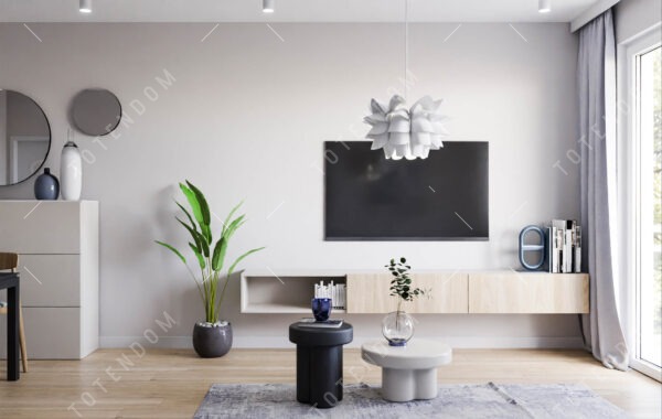 Wizualizacja salonu, gdzie lampa podłogowa stanowi efektowny punkt oświetleniowy, dodając przytulności i ciepła. Granatowe akcenty w wystroju wnętrza tworzą kontrast i nadają mu wyrazu. Duża jasna kanapa zapewnia wygodne miejsce do wypoczynku i relaksu. Panele podłogowe dodają przytulności i tworzą spójność wizualną. Oryginalna lampa wisząca stanowi wyjątkowy element dekoracyjny.