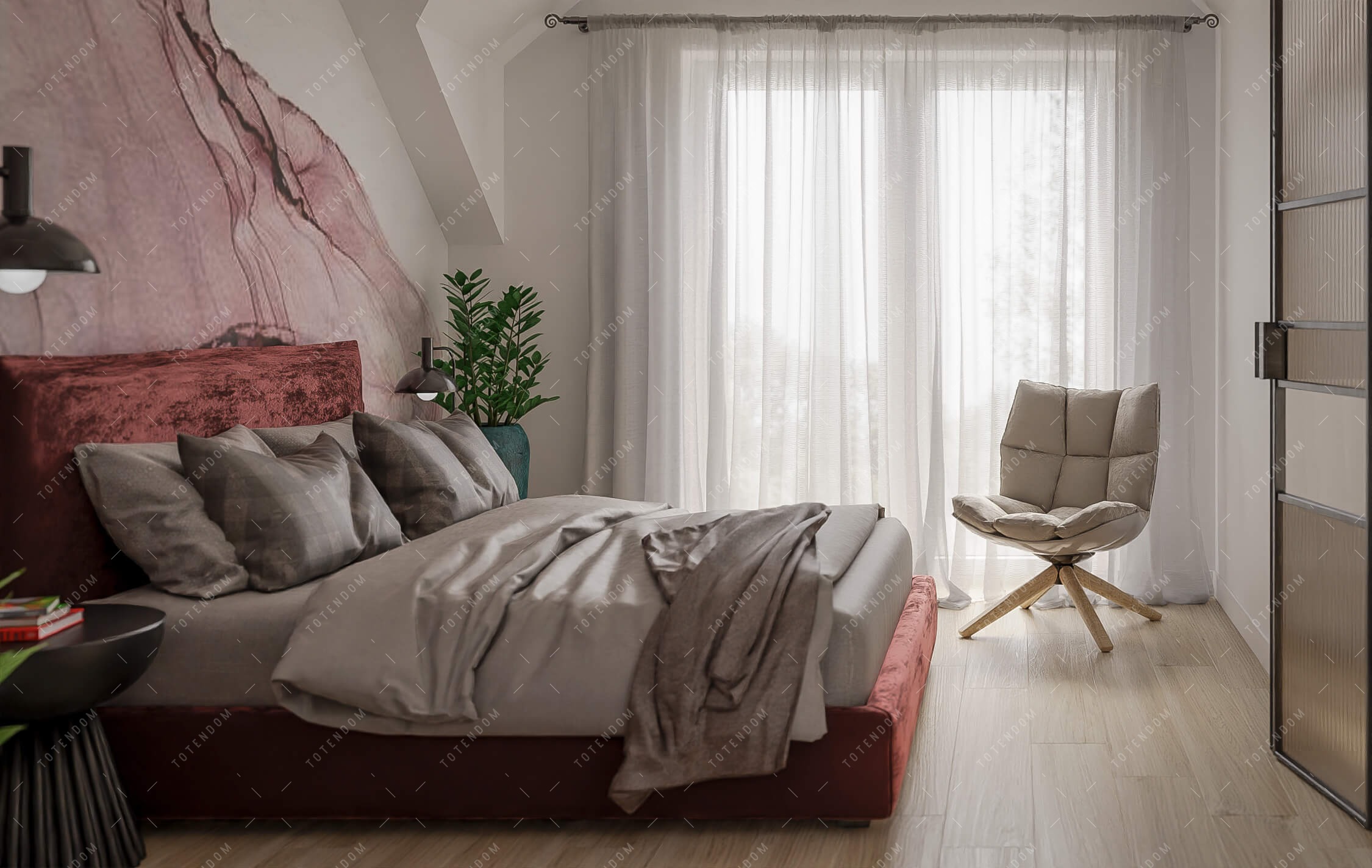 W tej sypialni dominuje duże łóżko, które stanowi wyjątkowy element centralny. Otoczone panelami podłogowymi, wnętrze emanuje naturalnym urokiem. Artystyczne malowidła na ścianach dodają wyrazistości i unikalnego charakteru, tworząc inspirującą przestrzeń do odpoczynku i twórczości.