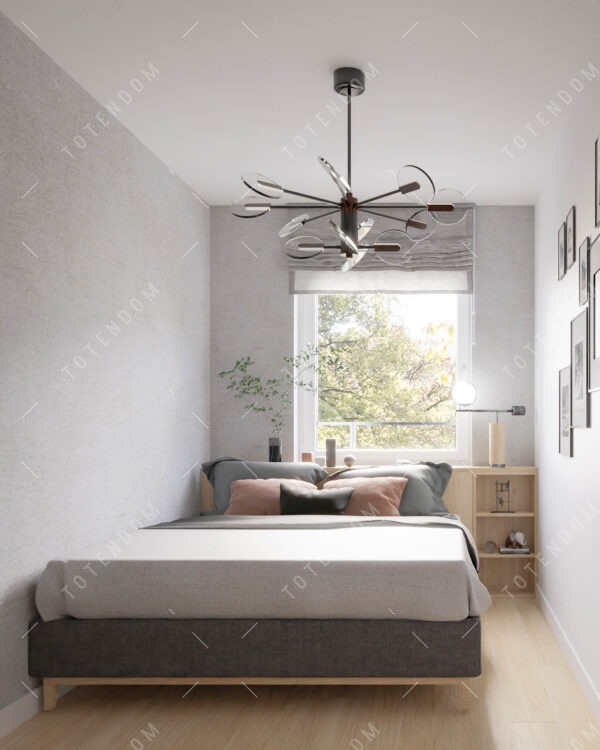 W eleganckiej, wysokiej sypialni o jasnych ścianach, podwójne łóżko stanowi imponujący akcent. Panuje w niej atmosfera harmonii i spokoju. Lustrzana toaletka dodaje wyrafinowanego charakteru, tworząc miejsce do pielęgnacji i przygotowań. To wnętrze, w którym każdy szczegół zachwyca i zachęca do relaksu i odprężenia.